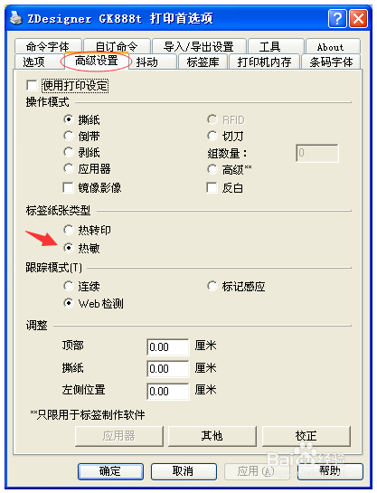第四步:選擇高級(jí)選項(xiàng)卡,設(shè)置相應(yīng)的標(biāo)簽紙張類型;這里設(shè)置為熱敏;
