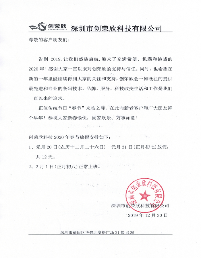 創榮欣2020年春節放假通知