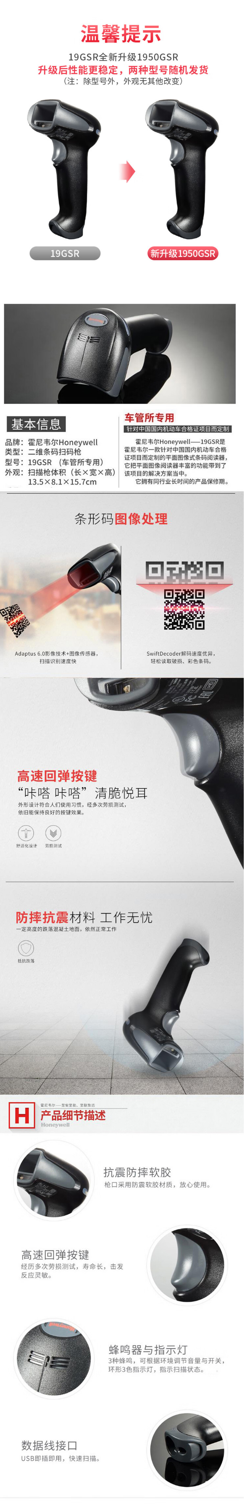 訂購:霍尼韋爾(Honeywell)1950GSR有線掃碼槍 條形碼 二維碼掃描槍 車管所專用 車輛合格證掃碼槍 工業掃描器